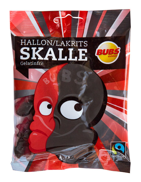 Very popular skull shaped Swedish lollies, half raspberry and half salty licorice! Fair trade. Suitable for vegetarians and vegans. 90g bag