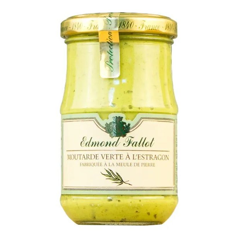This Edmond Fallot mustard is made from black and brown mustard seeds blended with fresh tarragon leaves. The mustard seeds and tarragon leaves give this mustard extraordinary flavors and textures. Dip fresh vegetables or shrimp, make an amazing potato salad, or whip up a luxurious tarragon mustard cream sauce for chicken using this mustard. 210g glass jar