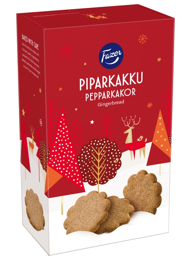 The small delicious gingersnaps ('piparkakku') tastes appropriately of Christmas spices and is delicious to be served at the Christmas lunchtime party. The small gingersnaps biscuit is just the right size to serve with, for example, mulled wine. The beautiful packaging is also great for a Christmas gift. Suitable for vegans and vegetarians. 175g box.
