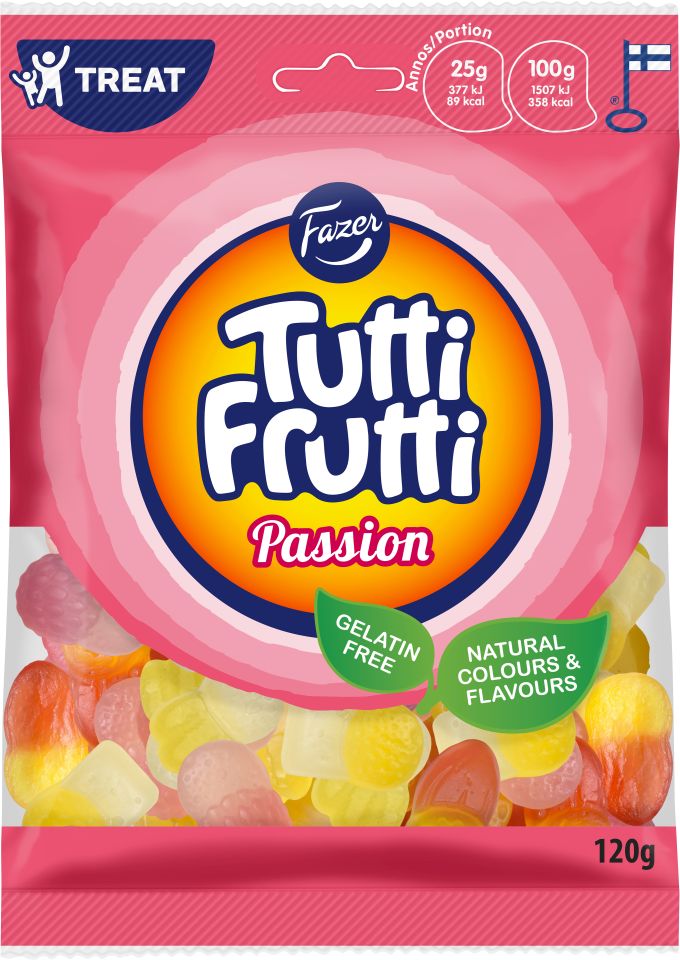 Tutti Frutti Passion is an exciting mix of tropical flavors. Tutti Frutti Passion is a gelatin-free vegan product made with natural colors and flavors. It gets its fresh taste from natural juices and colors from both fruits and vegetables. Enjoy yourself or make friends' day a little better! 120g bag
