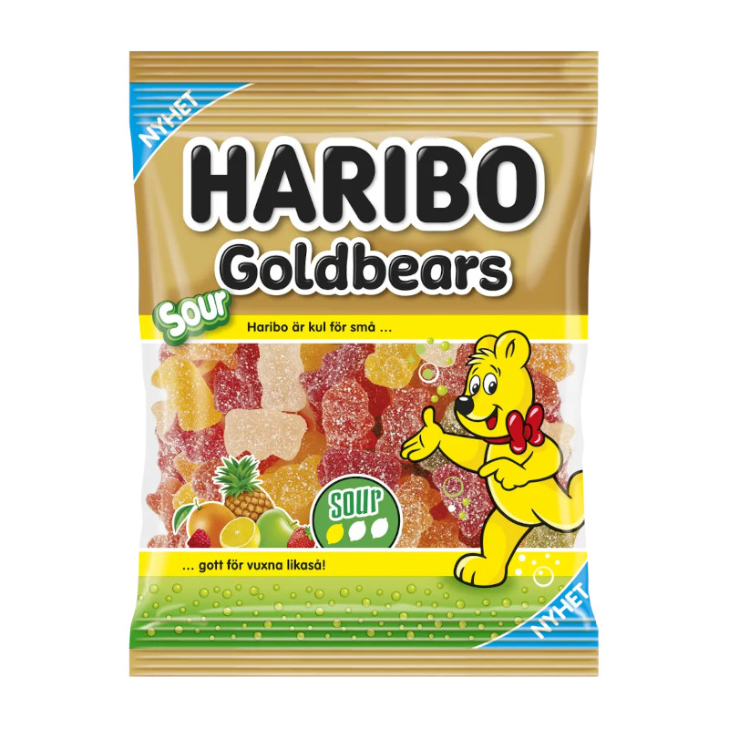 The iconic Goldbears have a new exciting sour flavor! Each bag of Goldbears Sour contains the classic flavors of lemon, orange, pineapple, raspberry and strawberry with a sour twist! 70g bag