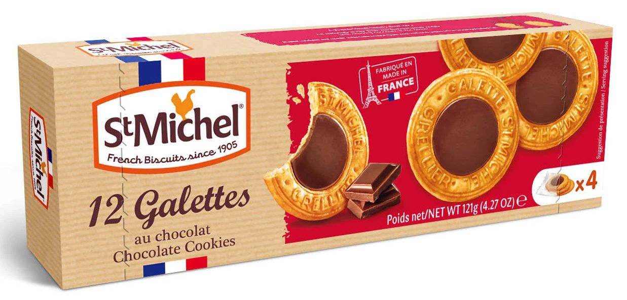 The St. Michel galettes are imprinted with the family name, along with an image of the archangel defeating the devil. With a delicious chocolate centre. 12 cookies per package. 120g