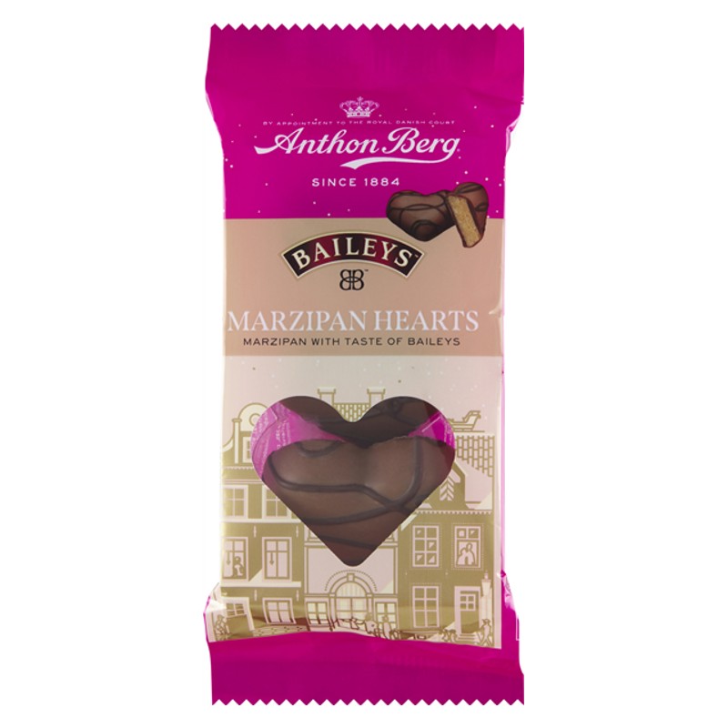 Gorgeous milk chocolate coated marzipan hearts with Baileys cream liqueuer flavour! 84g bag