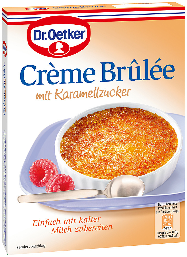 Preparation: Pour 200ml of milk and 200g of whipped cream into a saucepan. Stir the cream powder with a whisk and bring to a boil, stirring constantly. Cook at medium heat with constant stirring for at least 1 min. 2. Spread the cream on 4 heat-resistant racks or cups, allow to cool slightly and place in the fridge for at least 2 hours. 3. Sprinkle with sugar and caramelize with a gourmet burner. OR Preheat oven grill to highest level. Sprinkle with sugar and caramelise for about 2 minutes on top of the rack. Leave crème to cool slightly and serve.