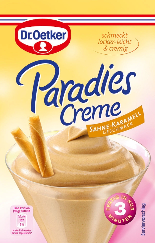 Dr. Oetker Paradies Creme Cream and Caramel Flavor is a delicious dessert that will spoil the whole family. Unmistakably a light, creamy dessert for every day. Simply pour it into cold milk, whip for three minutes, and it's ready to eat! A real paradise of pleasure. The paradise cream can be refined with dissolved nougat chocolate 65g. 4 portions. Gluten free.