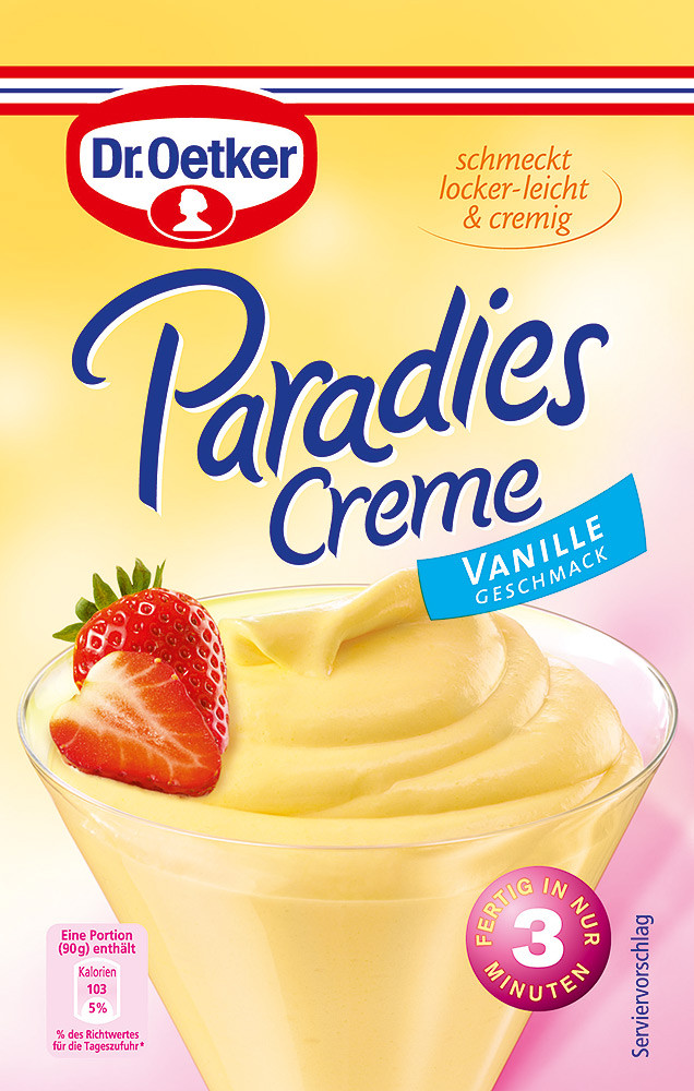Dr. Oetker Paradise Cream Vanilla is ever so delicious and a real treat for the whole family. Definitely a fluffy and creamy dessert for every day. Simply mix with cold milk and whisk it all for 3 minutes – ready for eating. A truly paradisian pleasure. 60g. 4 portions. Gluten free. Suitable for vegetarians.