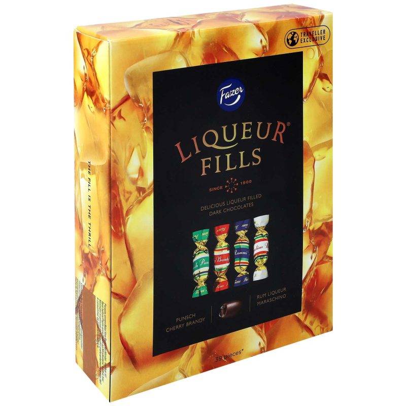 Fazer Liqueur Fills Chocolates are premium quality individually wrapped chocolate lollies with a variety of four liqueurs dipped in a thin layer of dark chocolate. The liquors are Rum, Punch, Maraschino and Cherry Brandy. 300g gift box