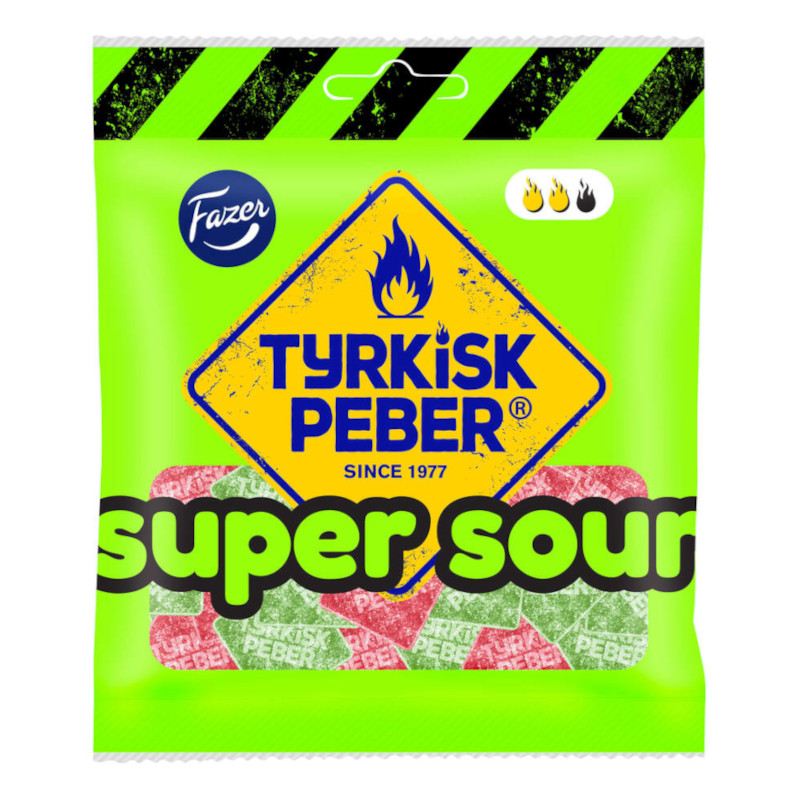 Craving for an intense sour kick? Tyrkisk Peber offers the perfectly sour experience with a mix raspberry and gooseberry super sour fruit candies, seasoned with the familiar Tyrkisk Peber hot twist. 80g bag