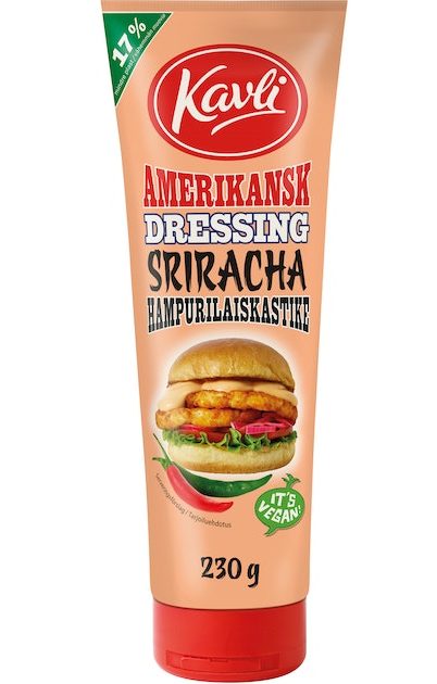 The most popular hamburger sauce in Finland and Sweden now with extra spicy sririacha. Also great with meatballs, fish and salads. Suitable for vegetarians and vegans. 230g.